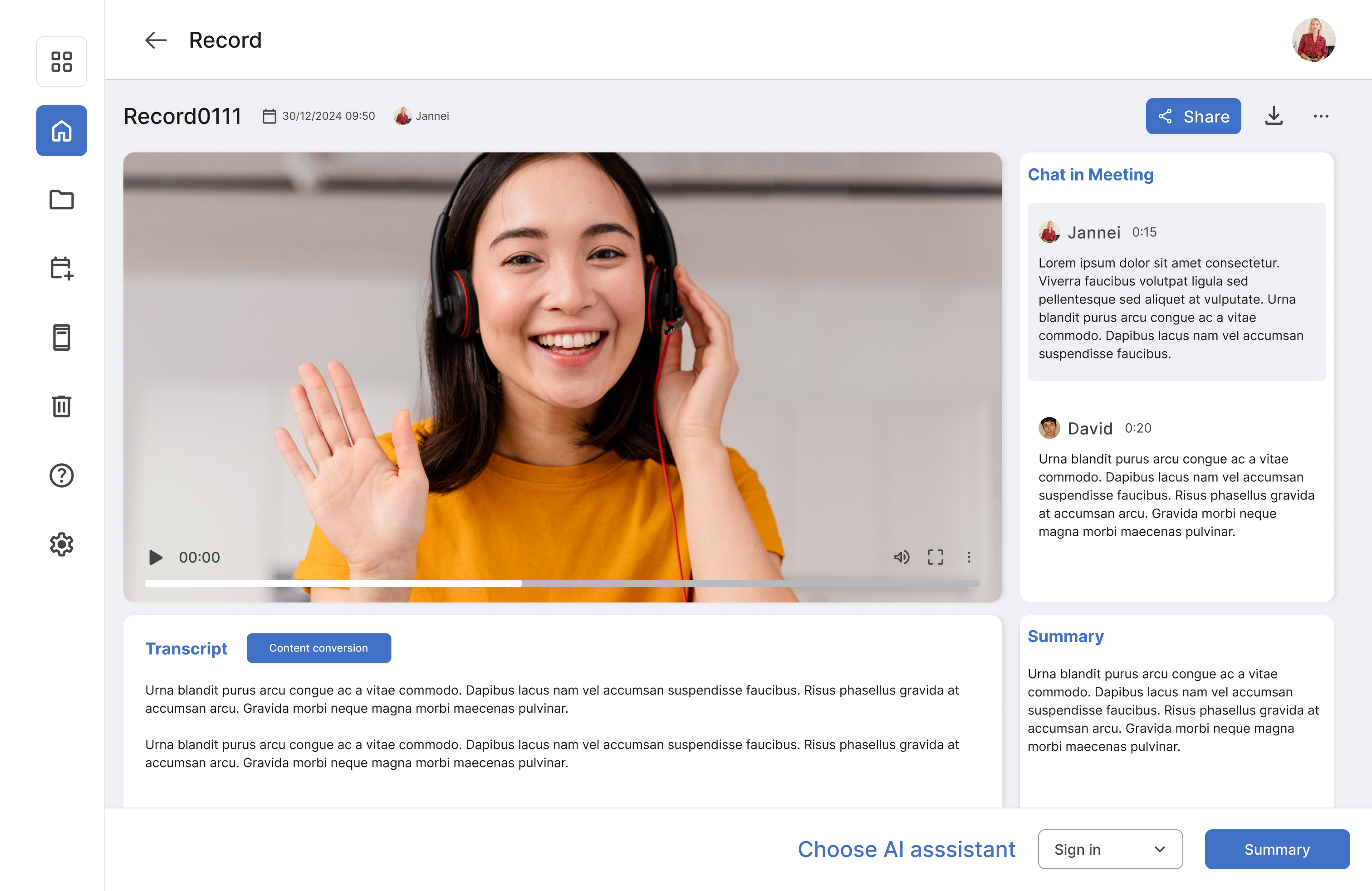 Zoom、Google Meet、Microsoft Teams会議に参加して、録音・録画の他に、会議内容の文字起こし及びAIアシスタント機能での会議内容要約・質問への回答が可能です。
